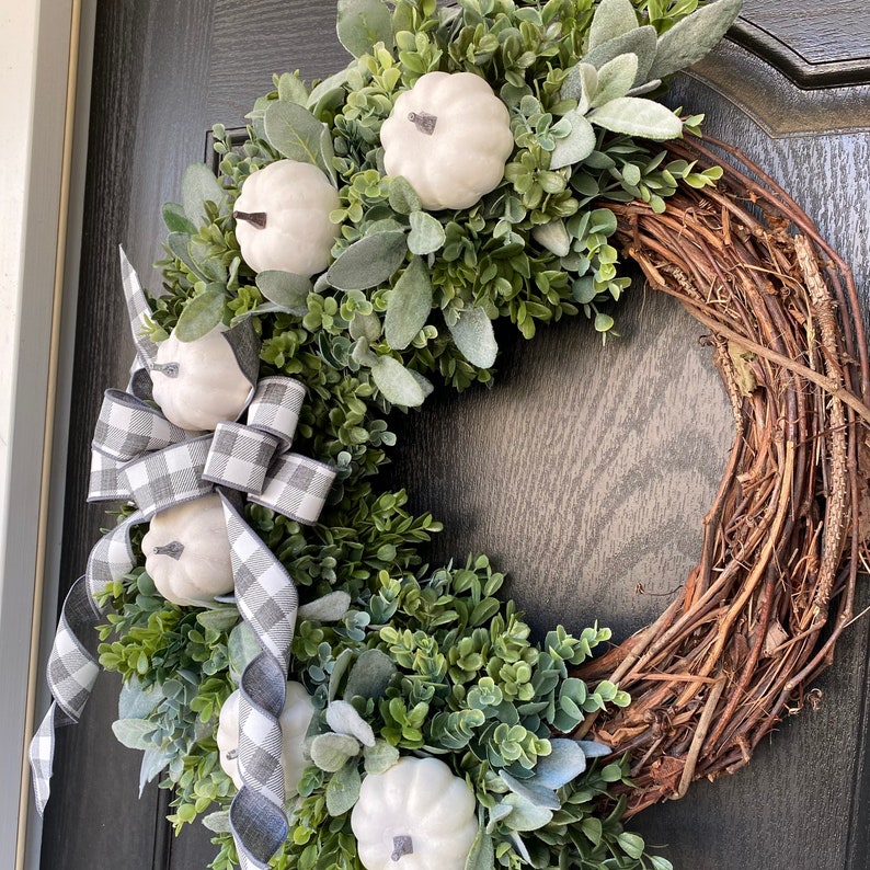 Farmhouse Fall Door Wreath with White Pumpkins